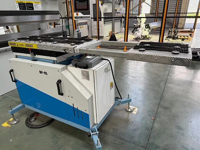 The hydraulic press brake equipped with a front sheet follower support system is specifically designed for bending long, thin sheets with greater ease and precision. This system consists of two support arms positioned at the front of the machine, aligned with the height of the bending line or lower die. Controlled by the CNC system, the supports actively follow the movement of the sheet during the bending process, providing continuous support to ensure accuracy and reduce operator effort.